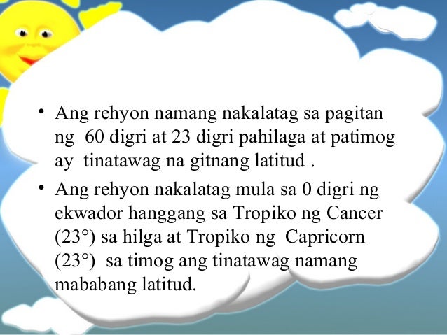 Ito rin ang mga linyang ginagamit upang tukuyin ang klima sa isang bahagi ng mundo. Contextual translation of ano ang kahulugan ng latitude. Pilosopiya sikolohiya lipunan agham atbp Ngayon may 3 mga anyo ng pagsasalamin.